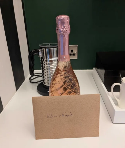Але коли ми повернулися до нашого номера (розкішного люкса «Торре»), на нас чекала пляшка рожевого просекко та листівка, адресована «такій чудовій парі».