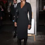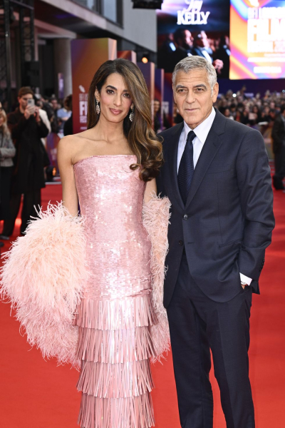 На офіційній прем'єрі BFI Амаль пройшлася червоною доріжкою під руку з Джорджем, сяючи у сукні без бретелей та відповідному пальто з пір'ям. Завдяки колекції високої моди осінь/зима 2025 від Тамари Ральф, сукня до підлоги мала елегантний прямий силует. Ліф, виготовлений з металевих рожево-рожевих блискіток, переривався на лінії талії багаторівневою бахромою з блискітками, створюючи ефектну спідницю, яка оголювала її туфлі на підборах Jimmy Choo з відкритим носком та мерехтіла на світлі.