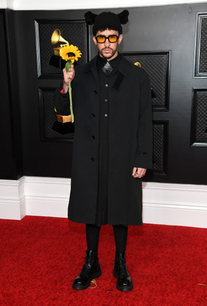 На церемонії вручення премії «Греммі» 2026 року володар премії «Альбом року» виглядав як переможець у своєму чорному смокінгу від кутюр від Schiaparelli, зробленому на замовлення. Хоча образ був класичним, він був аж ніяк не нудним — зі шнурівкою на спині та номерами у вигляді сантиметрової стрічки на одному плечі. Він поєднав його з чорною краваткою-метеликом і поклав білу квітку в нагрудну кишеню.